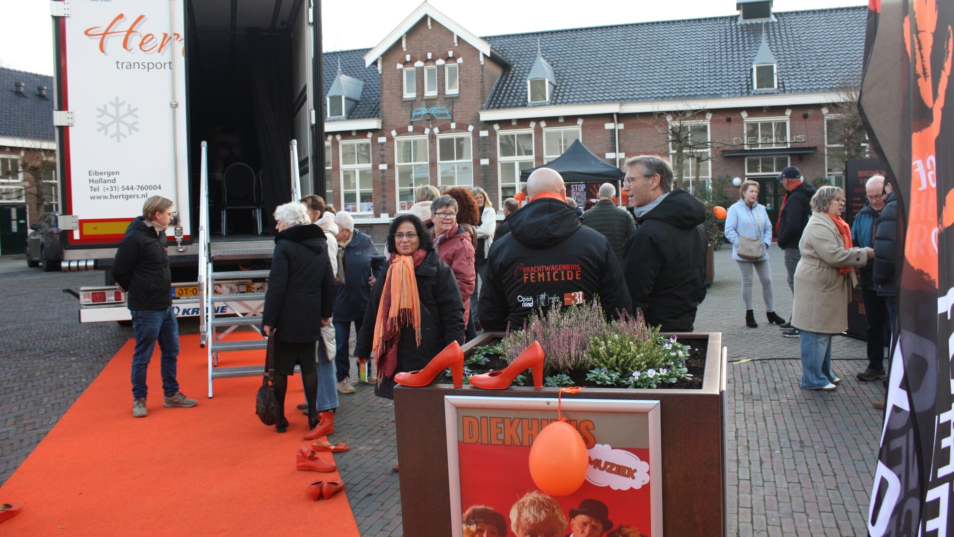 Bron: Eilanden-Nieuws - MIDDELHARNIS - Oranje damesschoenen op een oranje loper, die via een paar treden leidt naar het binnenste van een grote truck. Dit is de vrachtwagenbioscoop. Hij staat op het Diekhuusplein en hi..